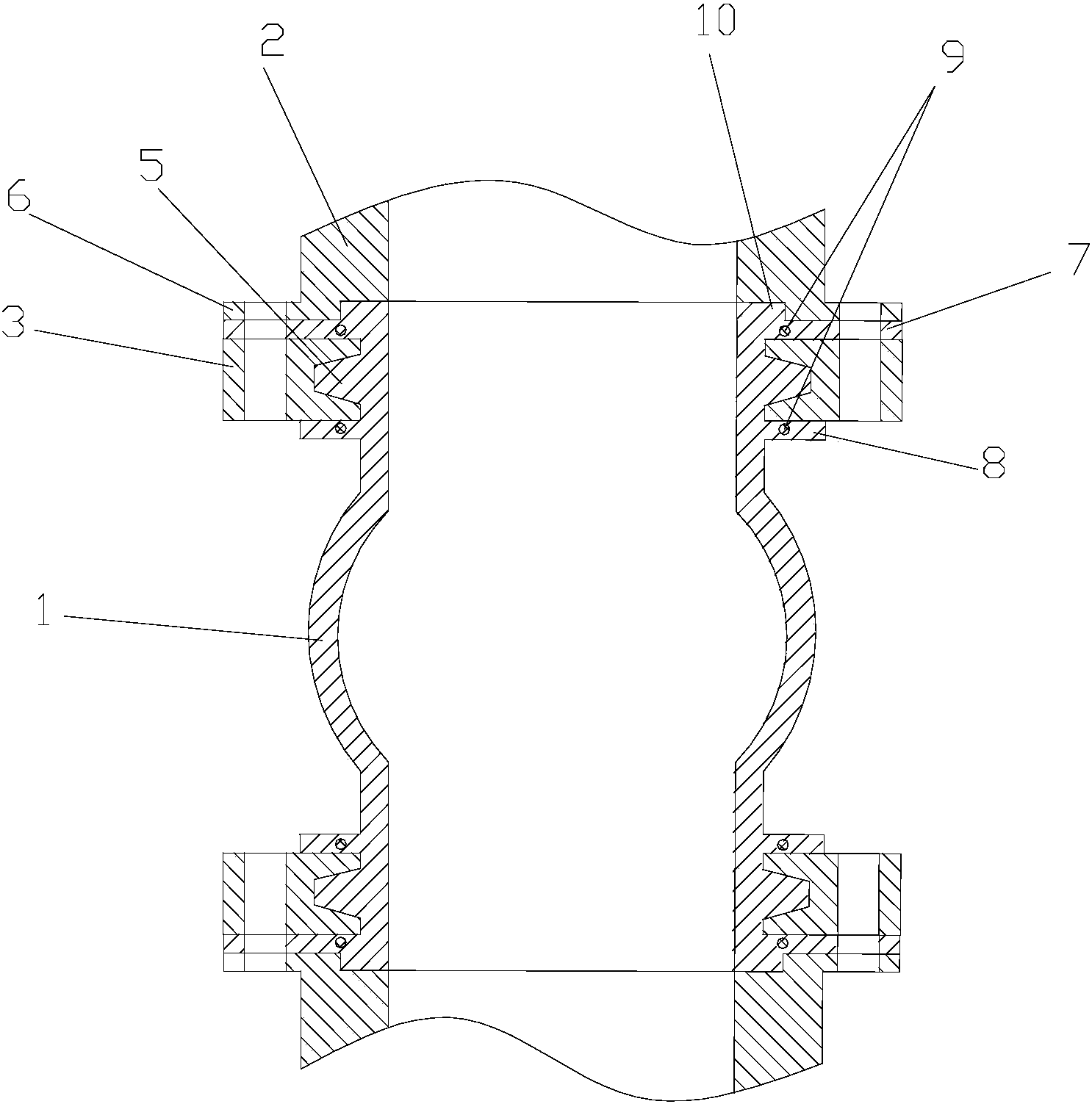 有鑒于此,本實用新型提**種污水處理管道用橡膠接頭,其結構簡單,易于使用,在與待接管道進行法蘭連接時不易造成接合淞動。