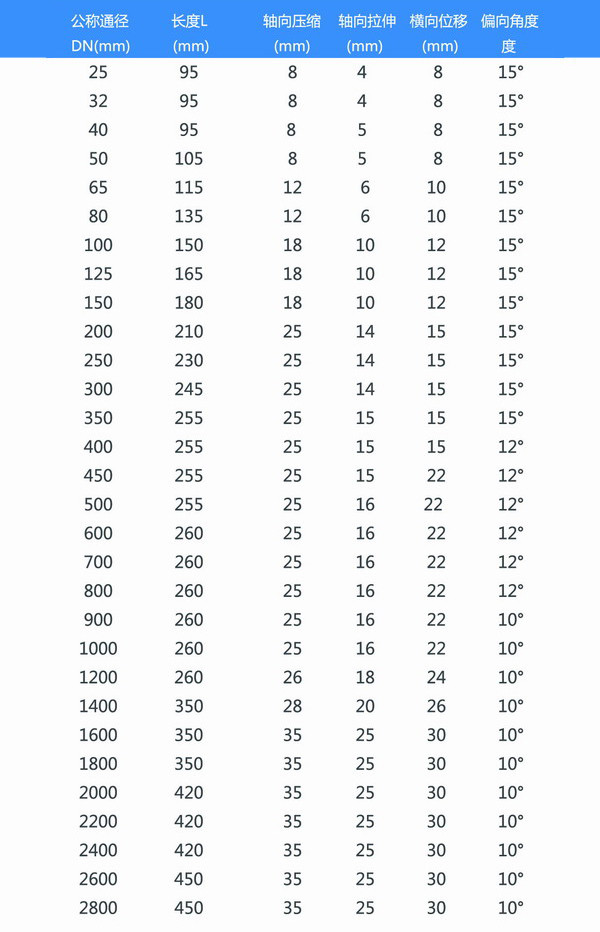5、當管道位移量大于等于接頭的.大抵償量時,應添加接頭的數量來平行位移量,.止為了調整管道的超差,使接頭處于.限的撓曲位移和誤差狀況,更不能超限度(彈性、位移、偏轉等),運用詳細設備數據見下表。