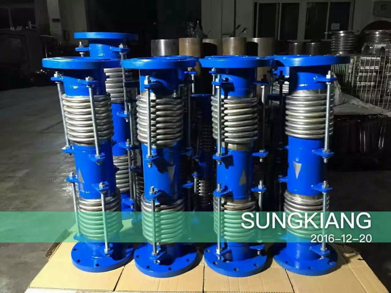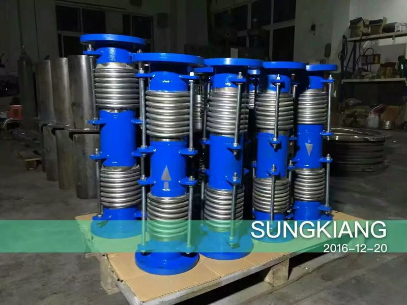 復式型波紋補償器由兩個(或兩個以上)波紋管和端管以及導向桿構成.用以吸收來自管線的軸向位移,它具有*定的抗彎能力和導向作用,以保證膨脹節在工作時波紋管不*失穩,但導向桿*承受內壓推力.安裝后應將兩端的限位螺母調整到額定補償量值或更大*點的位置,但*拆除.該類膨脹節具有大補償量、良好的自導向性等優點,主要補償空間橫向及軸向膨脹.應用在各工作管路上.